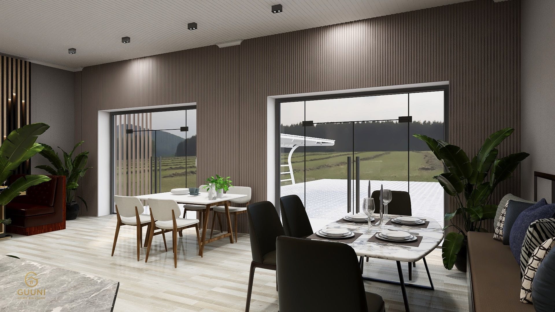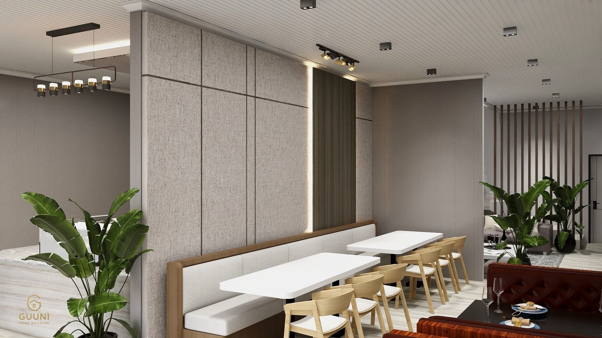 Ground floor dirancang sebagai ruang yang langsung memancarkan kualitas pengerjaan dan kehangatan desain khas Guuni Home Building. Setiap elemen—mulai dari bar, sofa lounge, hingga pencahayaan—dibuat untuk menunjukkan bahwa Guuni bukan hanya membangun ruang, tetapi menciptakan pengalaman.